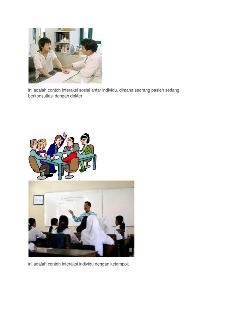 Selain berinteraksi antarindividu, manusia juga perlu interaksi individu dan kelompok. Antar kelompok orang, dan orang perorangan dengan kelompok. Hubungan antar manusia inilah yang menciptakan interaksi sosial diantara mereka. Siswa dapat memahami interaksi manusia. Melalui gambar di bawah ini kamu akan mengetahui contoh interaksi sosial.